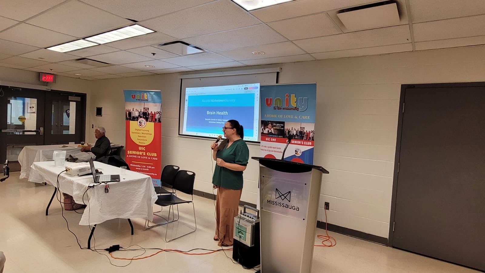 Jessica Pochodaj public educator of Alzheimer Society of Peel gave informative presentation at UIC Alzheimer Seminar at Mississauga Valley CC. She said that today, over 650,000 Canadians live with dementia and that number is expected to rise to 1 million by 2030. We need your continued support to ensure that people living with dementia, and those who love and care for them, have the resources they need, close to home.